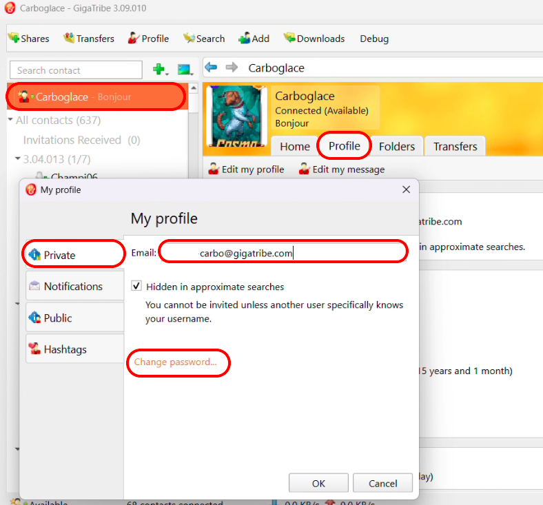 From the GigaTribe software, select your username in the left part of the window and then right-click ” Edit my profile “.